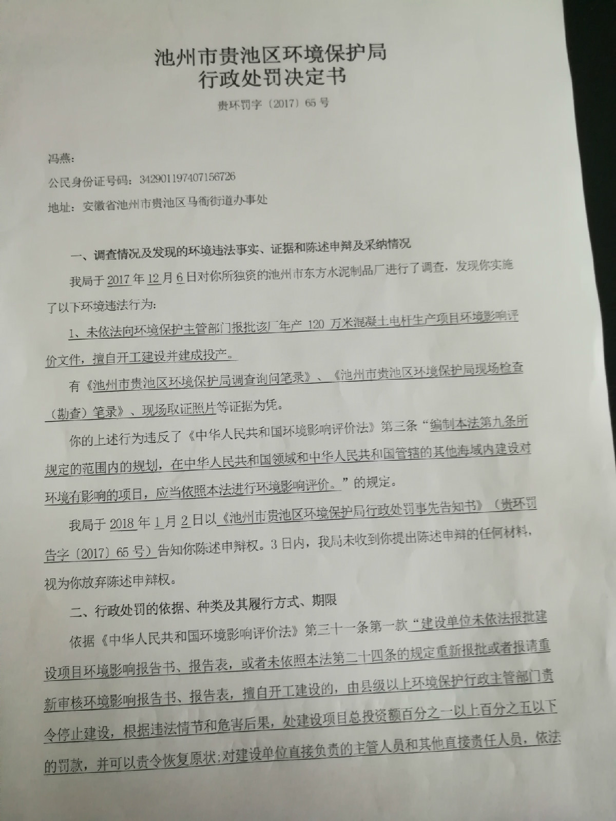 池州市贵池区环境保护局关于冯燕的行政处罚决定书(贵环罚字[2017]65号)