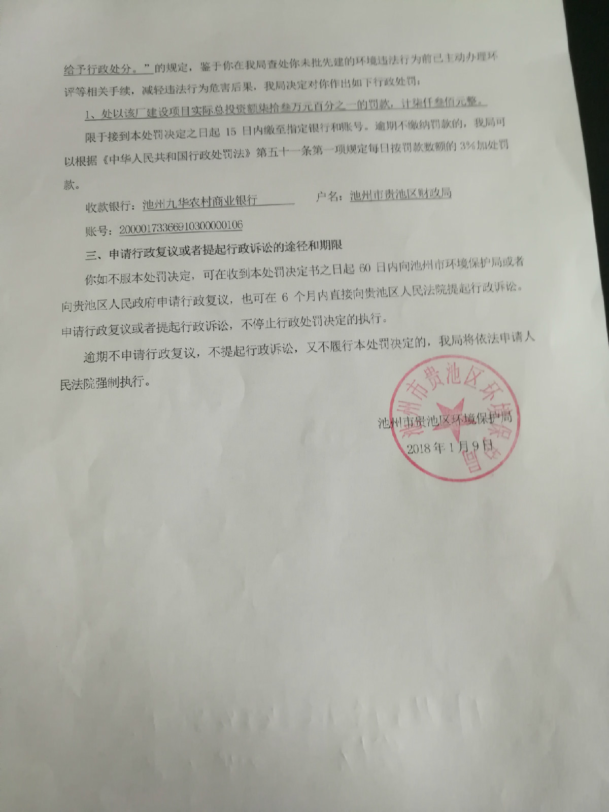 索 引 号:  032847231/201801-00421 名  称:  池州市贵池区环境保护局关于冯燕的行政处罚决定书(贵环罚字...